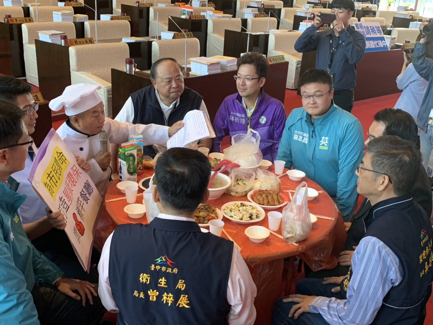 今日市議員鄭功進,特別巧扮廚師,在議場上透過實境辦桌,還原公路餐廳等大型宴會餐館及夜市攤商的塑膠使用,呼籲市府應投入更多資源,結合農業局、衛生局、經發局及環保局各局處的資源,落實真正的環保餐廳,守護你我的地球。