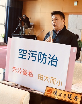 環保局長吳局長說明:空氣污染中的移動污染源佔了33%,陳廷秀說我們台中市府應先做表帥,做好空污防治,例如,電動警用摩拖車、清潔隊用車、公車電動化等等,應先公後私,由大而小,符合市長盧秀燕上任後,將空汙治理作為第一要務。