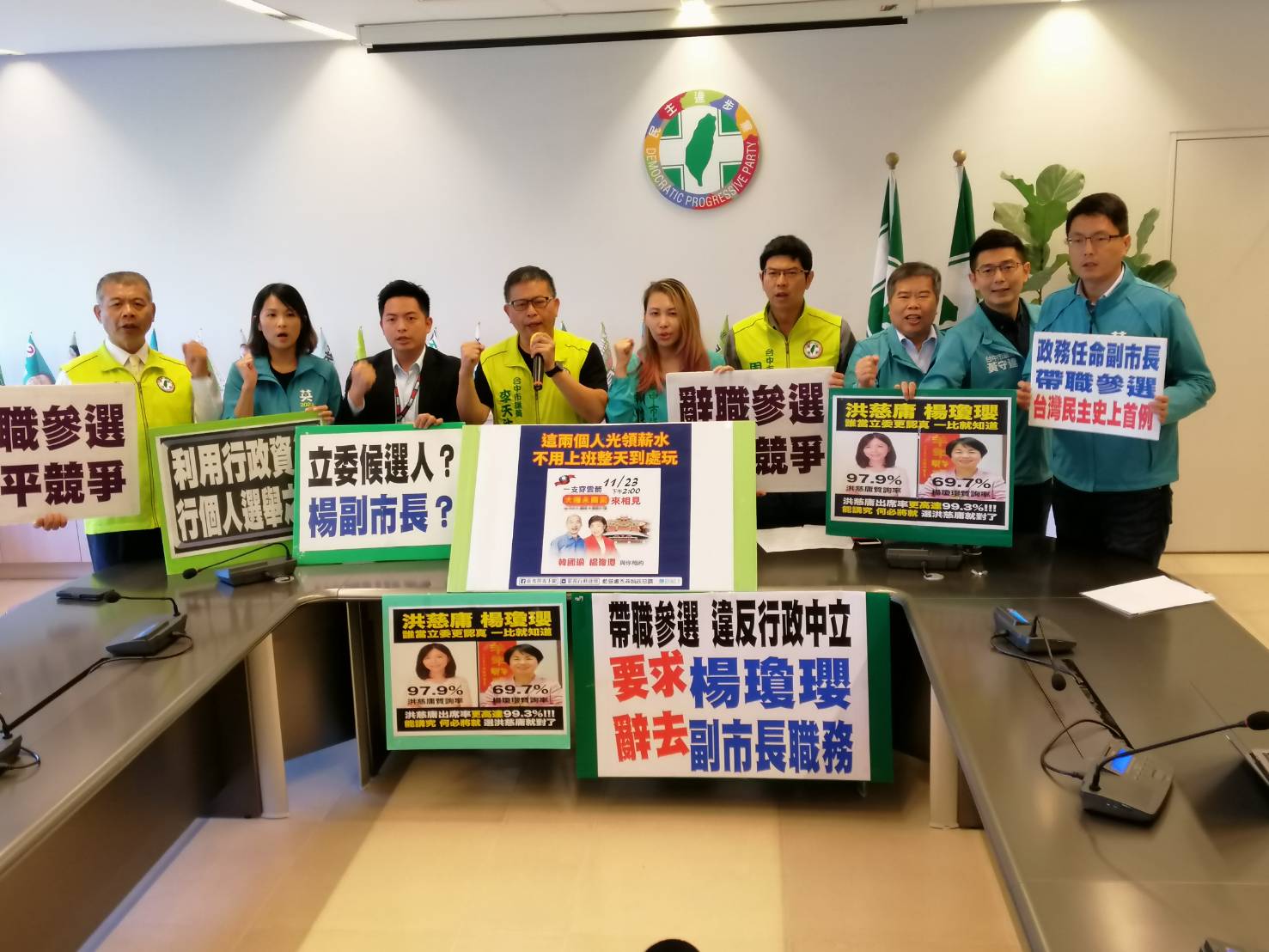 市政府副市長楊瓊瓔獲得國民黨徵召參選第3選區立委,不過卻遲遲不願意辭去副市長職務,民進黨團22日召開記者會嚴厲譴責,楊瓊瓔帶職參選「違反行政中立」、「利用行政資源行個人選舉之實」,要求她立刻辭職,公平競爭。