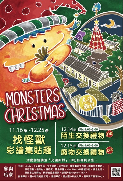 迎接2020台灣燈會並慶祝聖誕節,光復新村青創基地變身「怪獸聖誕村」,創業青年在村子裡點亮夢想聖誕樹,即日至12月25日推出「找怪獸 彩繪集貼趣」活動,遊客可以在村內活動店家找到各具店家特色的怪獸貼紙,活動期間集滿10張貼紙,即可兌換限量摘星環保提袋1個,歡迎前往霧峰光復新村找怪獸、集怪獸,度過歡樂聖誕節。