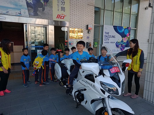 一早這群小小貴賓在大門前以英文「YES SIR!」整隊,讓原先嚴肅的派出所內頓時增添了許多歡笑聲。員警發現學童的英文能力不錯便向小朋友以英文的方式為師生逐一介紹警用槍械(Pistol)、防彈盾牌(bullet-proof shield)、防彈衣(bullet-proof vest)、頭盔(bullet-proof helmet) (等應勤裝備,以及警笛、指揮棒、反光背心等交通指揮配件等,這些難得的第一次,都讓這些小朋友們興奮的又叫又跳,並且踴躍地向警察哥哥、姊姊們發問。