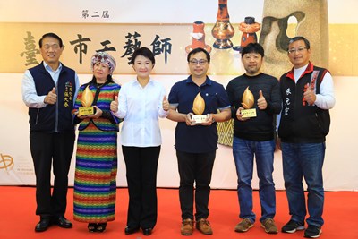 文化局今日舉辦「第二屆台中市工藝師」授證典禮,由市長盧秀燕為3位獲獎工藝師頒發榮譽證書、獎座及獎金。盧市長表示,「台中市工藝師」是由之前的「大墩工藝師」轉型而成,每2年舉辦1次,遴選優秀工藝人才,這次有3位獲獎,獎座特別委由知名雕塑家黃映蒲老師設計,底座並邀請書法名家蕭世瓊老師題字,給予工藝師們最大的肯定,希望藉此讓工藝文化得以傳承並發揚光大。