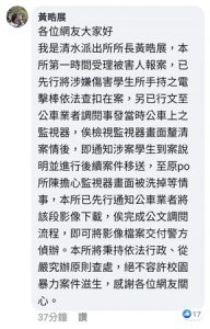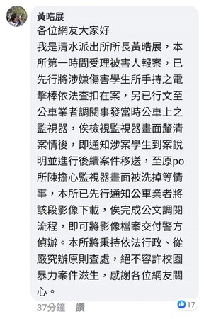 文章曝光後引發許多網友怒火,台中市政府警察局清水派出所所長黃皓展也在底下發言,指出已經先行將涉嫌傷害學生所手持之電擊棒查扣,也已經行文至公車業者調閱監視器畫面,等檢視後釐清案情,將通知涉案學生到案說明。
