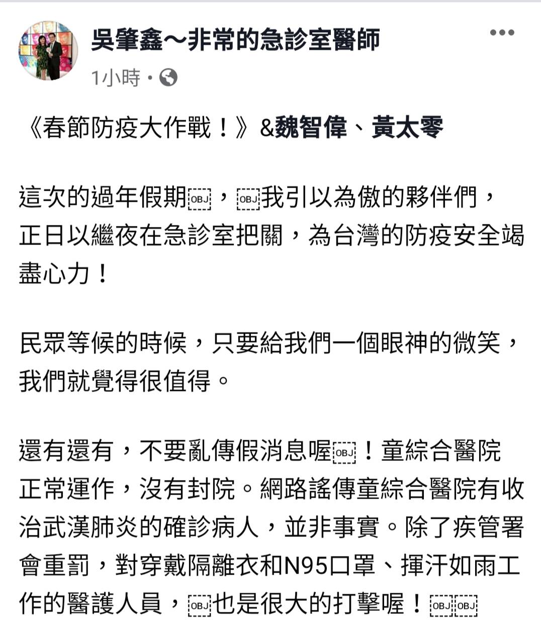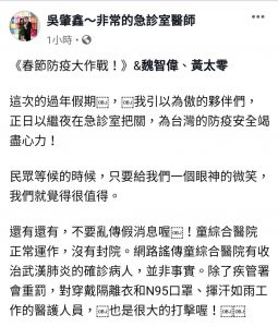 網友今天在臉書PO童醫院急診室照片,有人消毒,也拉起封鎖線,這名網友寫上「完了完了完了」,還寫著「童醫院封院了」,還寫「武漢肺炎」等字詞,引起網友討論。