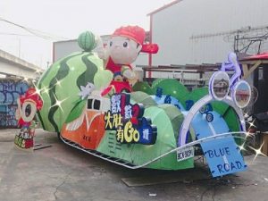 此外,大肚區花燈車以磺溪書院、文昌帝君及農特產品西瓜為主軸,車頭由西瓜再頂小西瓜包覆設計,小西瓜裡有文昌帝君圖像可定時開合,象徵西瓜出狀元,車身則以一手比讚、一手持粽子的狀元燈座象徵高中科元,搭配藍色公路、瑞井古井、萬里長城登山步道、追分火車站等,呈現在地景緻。