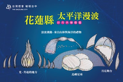 花蓮縣文化局長江躍辰表示,花蓮以「太平洋漫波」為主題,規劃「月亮舞台」、「島嶼星座」、「浪波潮動-來自山林和海洋的禮物」、「光升起的地方」等作品,展現花蓮人在好山好水的洗禮下,蘊含堅韌、柔軟、包容、分享且優雅的特質。