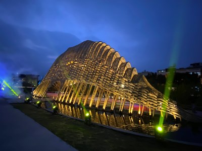 台中市政府於豐原葫蘆墩公園注入璀璨元素,將公園中第四區內曾入圍「2018 WAF世界建築獎」的明星作品「竹跡館」,結合燈光藝術,進行動態展演,今晚點燈,賦予竹跡館繽紛、活潑新生命。