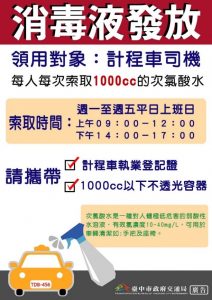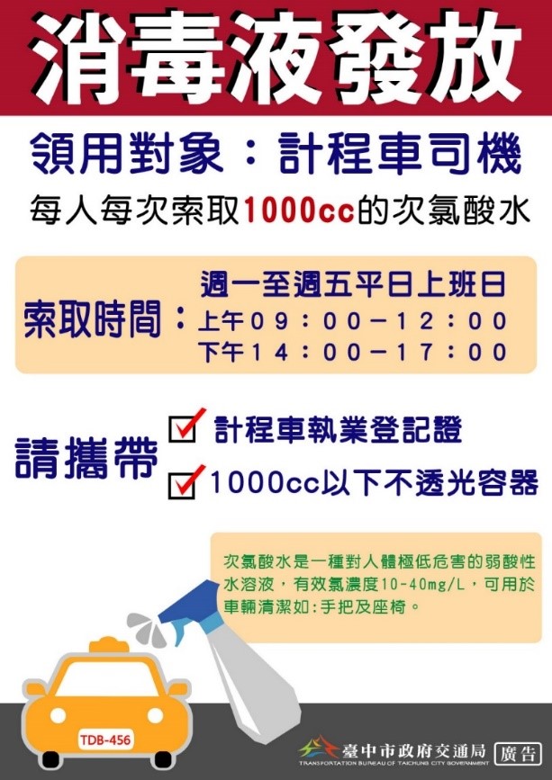 葉局長表示,為使防疫資源更妥善調度及運用,自3月2日起至3月13日止,免費計程車消毒作業調整為週一至週五下午1時至5時,統一在文心拖吊場辦理;次氯酸水消毒液則持續免費提供,請計程車駕駛週一至週五上午9時至12時及下午2時至5時,攜帶執業登記證並自備1,000cc以下不透光容器至交通局裝取。