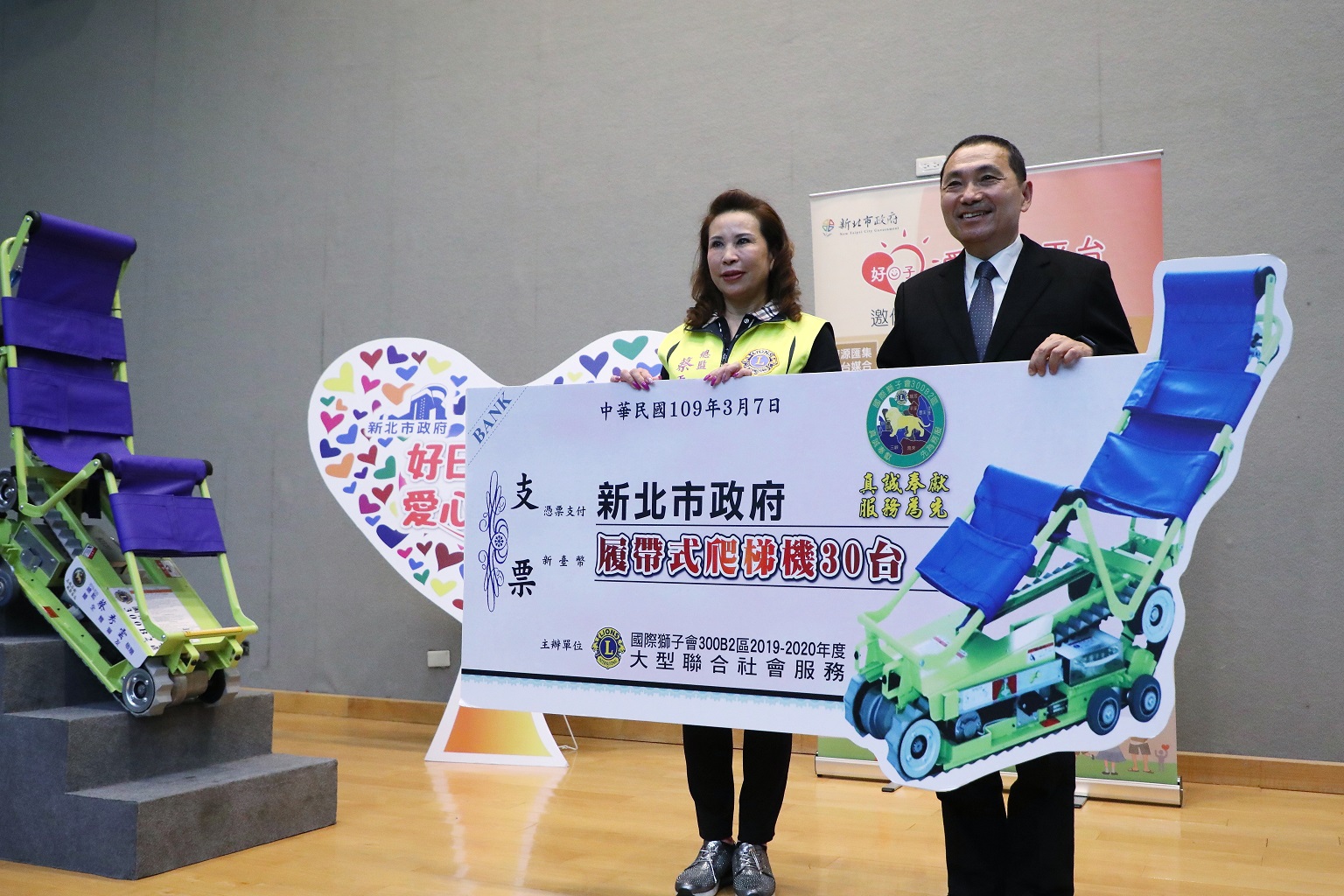 國際獅子會300B2區捐贈新北市輔具中心30台履帶式爬梯機,市值約600餘萬,新北市長侯友宜今日出席捐贈儀式,感謝捐贈者的愛心,造福更多長者與行動不便的人。