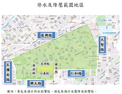 經發展局表示,停水區為南區德義里,包括學府路以東、國光路以西、仁義街以北、忠孝路以南,影響約200戶數;降壓區為南區德義里、江川里、積善里、長春里、新榮里、城隍里、國光里、長榮里,以及東區東興里、振興里、新庄里,包括五權南路以東、大智路以西、興大路及仁和路以北、復興路以南一帶及鄰近巷弄,約9,500戶數。