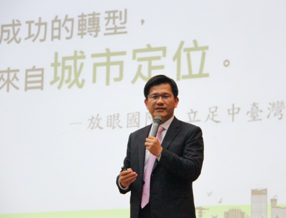 「成功的轉型,來自城市定位」針對縣市合併後產生的「市區空心化、縣區邊緣化」危機,林市長分享市府啟動的城市復興運動,他表示,市府對台中進行再定位,並聯合彰化、南投、苗栗進行區域治理,形成中部生活圈,期望放眼國際,立足中台灣。