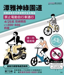 觀旅局表示,為維繫休憩安全與品質,4月25日起依據「道路交通管理處罰條例規定」第5條規定,禁止騎乘電動自行車進入潭雅神綠園道,除各路口處已完成設置中、英、泰、越南及印尼文等5種語系的禁止騎乘電動自行車告示牌面計77處,並結合勞工局、經發局、公所及里辦公處等各局處單位加強宣導。