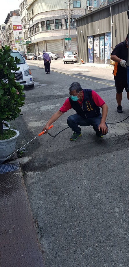 4/29動員里內環保志工,一起深入沙鹿區鹿寮里、每一戶外水溝,甚至菜市場、公園大樓等公共空間,噴灑消毒殺菌。搭配家家戶戶清潔打掃,達到社區防疫效果。