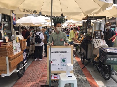為避免出遊人潮聚集,台中市熱門景點審計新村文創園區採取人流監控,將園區分為A、B兩區,各於管制入口處以紅、黃、綠燈號提醒遊客目前人數,若燈號顯示紅燈,代表管制人數已滿,將暫停遊客進入。此外,園區內公共區域及公廁定時清潔消毒,並加裝乾洗手於7處消毒點,讓民眾可以安心購物。