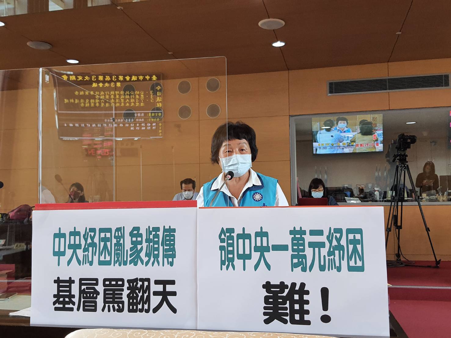 台中市議員張瀞分說,民眾排隊買口罩之亂才剛稍微有點緩和,現在為了紓困竟然又大排長龍,而且排隊還不一定領得到,很多經濟弱勢民眾誤以為只要拿身分證登記就可以領一萬塊,事實上並非如此。張瀞分唸出目前已知可能的申領條件,包括原本有工作但因疫情請假或無法從事工作導致家庭生計受困;沒有加入軍、公、教、勞、農等社會保險;要先釐清家戶人數,並搞清楚共同生活戶內所有成員的收入,算出一月到四月的平均月收入,還要拿出證明;再來還要調查一月到四月共同生活戶所有成員的存款狀況並加總計算,再換算平均每人生活費;最後還要將換算出來的生活費數字和各縣市的最低生活費比較,擠進各縣市最低生活費的1.5倍至2倍之間,才能領這1萬元。