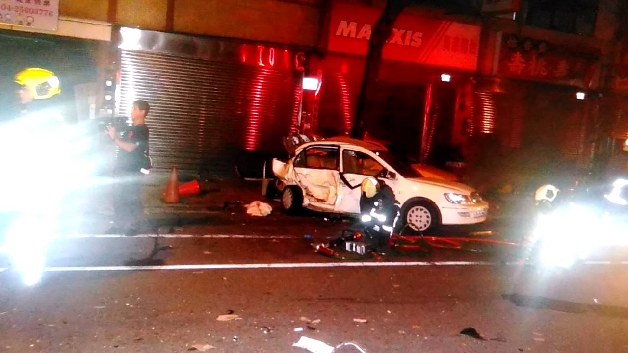 車禍現場滿地散落汽車零件、碎玻璃,地上被刮出一條長長的輪胎痕跡,肇事車輛的車頭嚴重毀損,擋風玻璃碎裂,遭撞的白色轎車車門嚴重凹陷,路邊2台轎車,1台左前輪鈑金、車燈被撞壞,另台後車廂也有毀損。