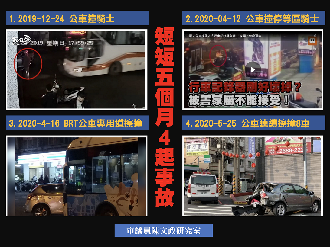 市議員陳文政針對公車意外頻傳一事,向交通局提出質詢。陳文政表示,近日台中市民都發現公車意外發生頻率增加。經統計,108年12月~109年5月間,不到半年的時間,就發生了4起重大意外。其中今年4月12日的事故,奪走了一條正值花樣年華的生命,但公車的行車記錄器竟然「沒有運作」!陳文政指出,公車屬於營業用大客車,根據道路交通安全規則第39-1條,自民國96年起就強制要求須裝設行車記錄器,並且要定期檢驗。但行車記錄器的相關罰緩卻非常的低,以本案例來說,車輛所有人僅開罰9,000~12,000元,幾乎要比行車記錄器還便宜。陳文政痛批,這種罰緩對業者來說根本不痛不癢!