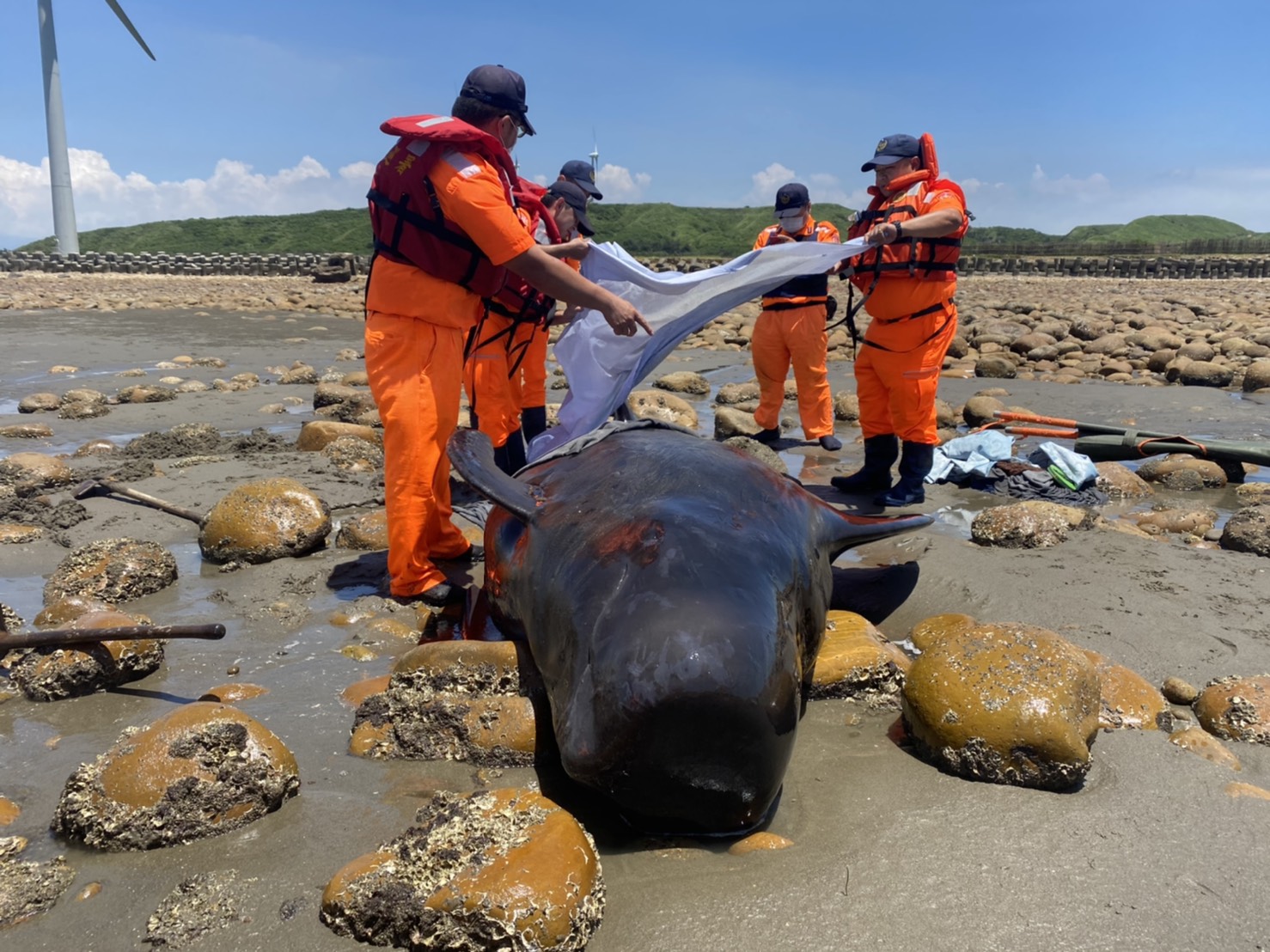 鯨豚協會秘書長李宗翰表示該鯨豚品種為領航鯨,請本隊同仁協助將該鯨豚持續保濕,遵循「三要四不原則」,要扶正、要保濕、要紀錄呼吸心跳、不要站在離他們尾部和頭部太近的地方、不要推拖拉扯牠們、不要翻動牠、不要喧嘩,並預定於今日下午3點派員前往現場處理。