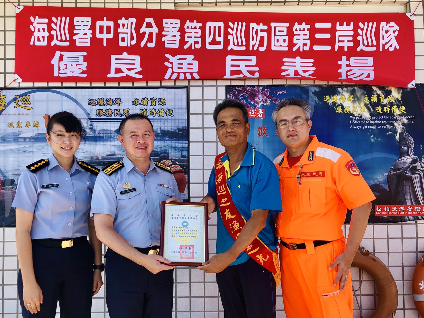 海巡署中部分署第三岸巡隊於今日由隊長葉兆航親自帶隊至梧棲安檢所及松柏安檢所辦理109年優良漁民表揚。