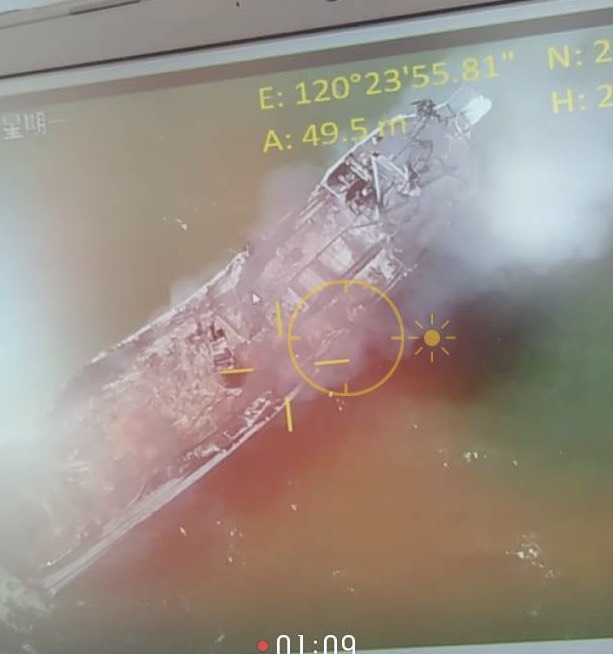 海巡署中部分署第三岸巡隊塭仔安檢所塭仔北守望人員發現肉粽角沙灘正前方約1.5浬有1艘梧棲籍漁船在海面起火燃燒,緊急呼回報海巡署第四巡巡防區派遣巡防艇協助,漁船上的3名船員均被附近作業漁船「泰山1號」順利接駁救援,所幸無人受傷,起火原因待查。