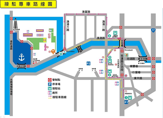 本次活動會場至各主要停車場間,均設有免費接駁專車供遊客搭乘使用,接駁站計有福海宮→活動停車場→王功美食街→重興海鮮樓→王功漁港(來回往返),接駁專車每15至20分鐘1班車,遊客可以妥善運用大眾交通工具接駁專車,進入各活動會場,並請各位遊客配合警方所實施之管制措施,以維護交通順暢。