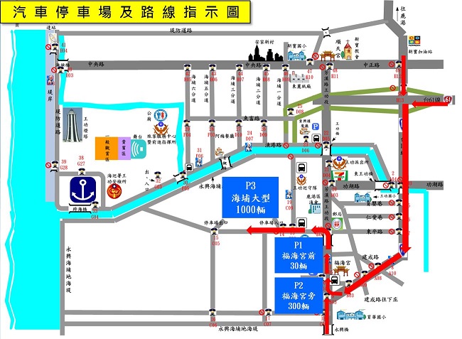 (二)主要停車動線:由台61線下王功交流道南下(芳苑交流道北上),沿台17線至芳漢路王功段路口進入,可停車於福海宮前及福海宮旁停車場;如福海宮附近停車場停滿,會由現場交通警察引導往海埔大型停車場停放。