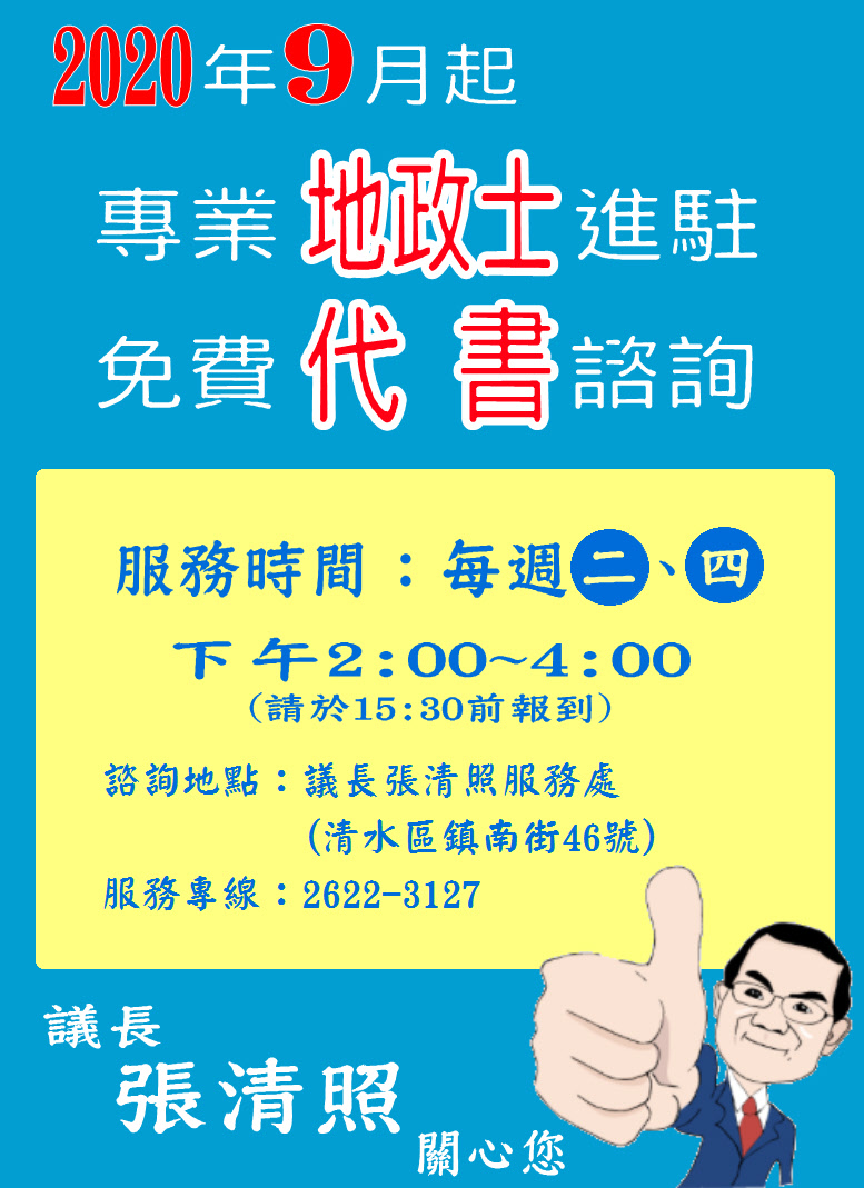 目前訂每週二、四下午二點至四點,由陳勇志、邱紹恩專業代書在張議長的清水服務處駐點,提供免費諮詢。張議長表示,為民服務除了讓鄉親方便之外,也要尊重專業,在專業的協助下,才能提升服務品質。