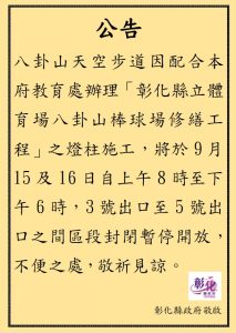 八卦山大佛風景區天空步道,因配合縣府教育處辦理「彰化縣立體育場八卦山棒球場修繕工程」之燈柱施工,為維護施工期間遊客安全,將於9月15(二)、16日(三)自上午8時起至下午6時止,為期二天,3號出口至5號出口之間區段封閉實施管制禁止通行,以利工程施工進行,彰化縣政府呼籲遊客配合天空步道管制告示。