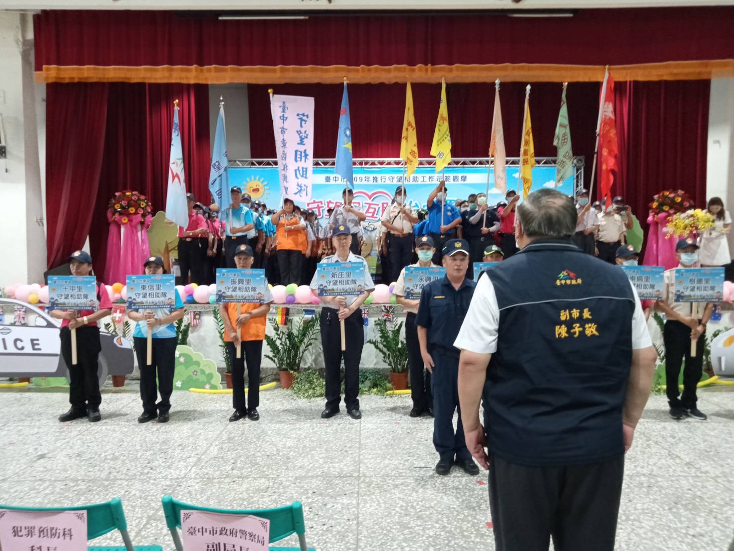 副市長陳子敬出席主持並指導本次守望相助示範觀摩,除向參與的隊員夥伴致意外,另也提醒隊員們於協勤時注意自身安全,發現歹徒或犯罪情資時,以通報警察機關處置為優先,縱使未能立即將歹徒繩之以法,也能透過後續的追查,將不法之徒緝捕到案,共同伸張正義。也讓我們一起朝「富市臺中、新好生活」願景而努力,打造臺中市持續成為治安平穩、幸福快樂的宜居城市共同努力。