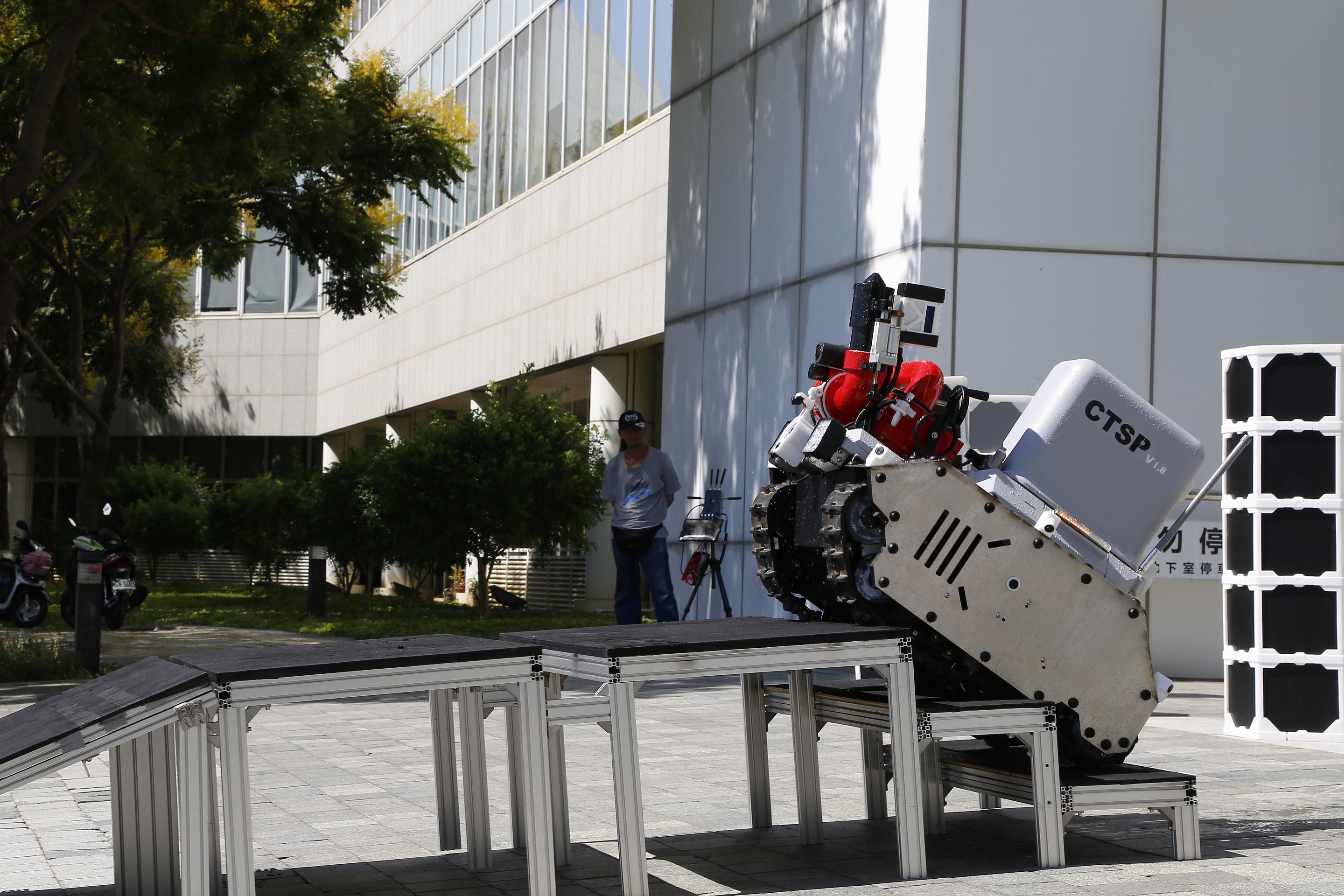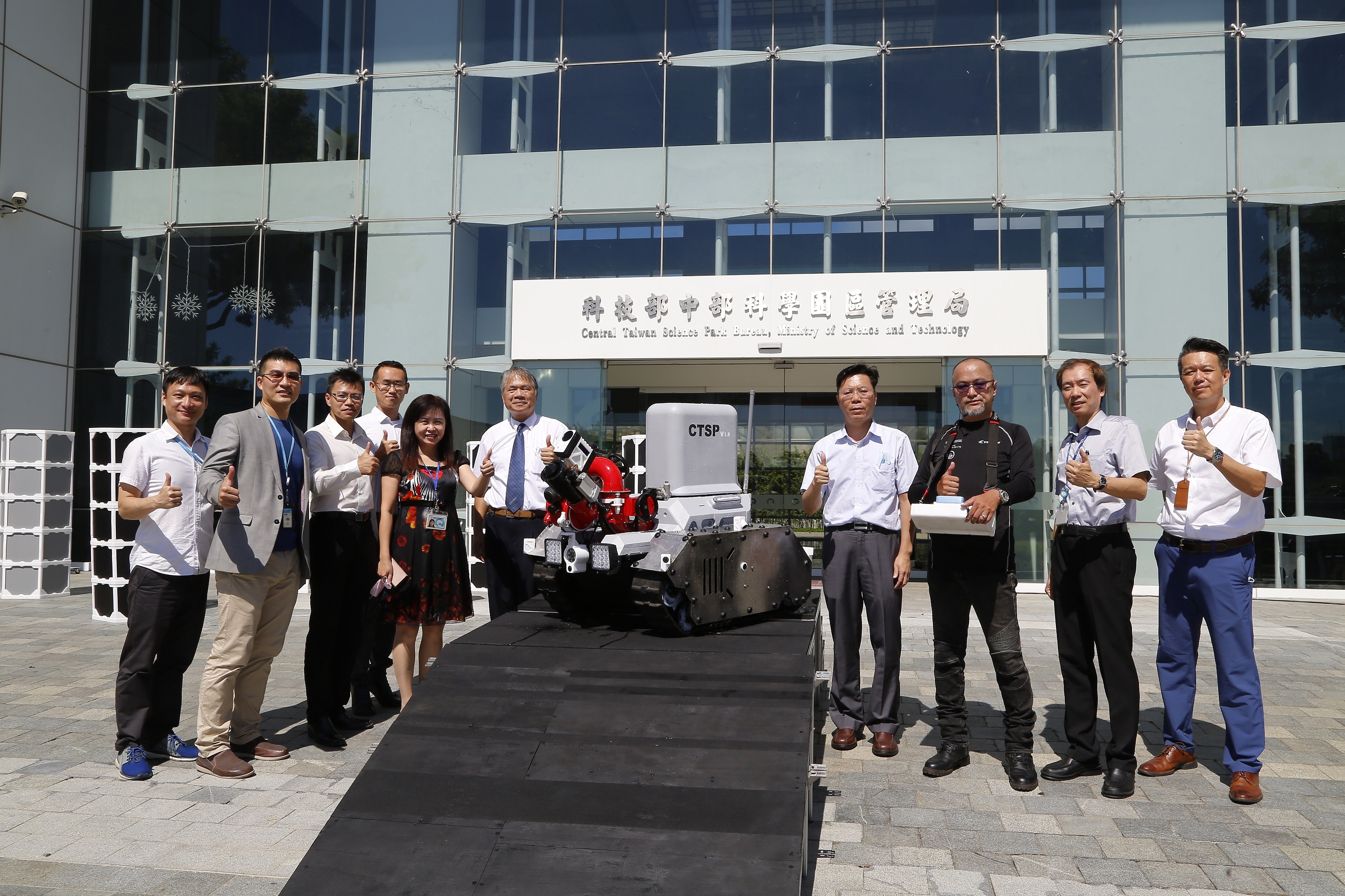 中部科學園區管理局上午展示了一款由園區智慧機器人自造基地與工研院合作開發的「AI智慧災防機器人」,這是中科首次依園區廠房的特殊環境條件需求所開發的原創產品,不但能比消防員更近距離接近火場灑水,還具備遠程遙控、八方位感應避障、爬梯防傾覆、有害氣體偵測及智慧視覺辨識火源偵測等特殊功能。