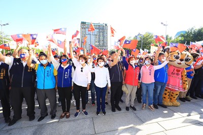 台中市政府今日在府前廣場舉辦國慶升旗典禮,現場突破2萬人潮,旗海飄揚,氣氛High爆,捷運綠線市政府站今日也首度開箱,上午就擠爆數千參觀人潮。市長盧秀燕表示,今年雖受疫情影響,但市府團隊化危機為轉機,台中購物節突破90億元、招商引資1800億元全台最佳,全力振興經濟,另外空污治理也逐步展現成果,今天藍天白雲就是最好證明。