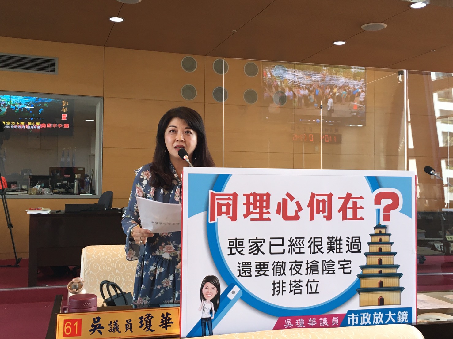 市議員吳瓊華表示依詢問過生管處的資料,台中市公立塔位數量總櫃位數有34萬1174位。目前已使用總數28萬8920位,未使用數是5萬2254位,但依這樣的數據來計算每年需求量約1萬1500位。所以看來剩下的塔位也沒幾年就應該是會消耗完畢!先人的塔位是有大量有所需求的。