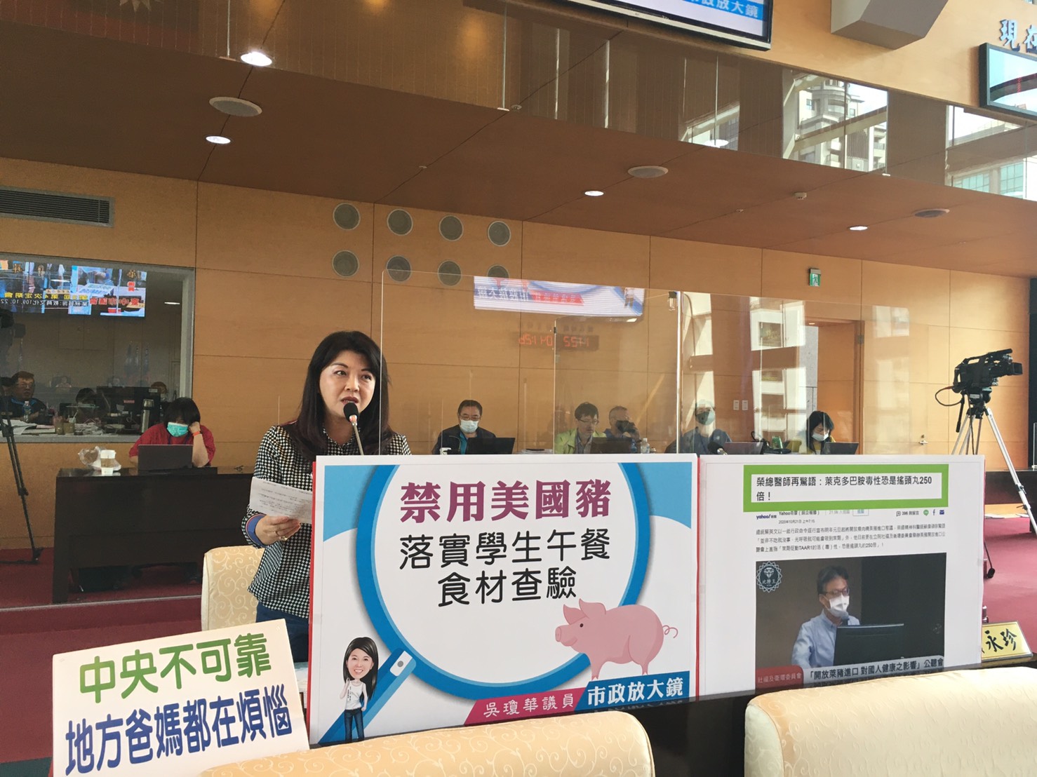 市議員吳瓊華於今日臺中市議會教育文化質詢中指出,自從中央執政的民進黨,宣布「含瘦肉精的美國豬」明年可以進口,全台灣的地方媽媽跟地方爸爸都特別的煩惱!因為小孩子在外讀書,常常三餐都會吃到外食,包括在學校的團膳、營養午餐,民進黨對瘦肉精、萊克多巴胺放水,民眾反彈再大都不管,現在又有醫師,提出「萊克多巴胺毒性恐是搖頭丸250倍!」這是多麽嚴重的警訊!地方的爸媽怎麼能安心!