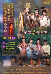 台中市清水區公所邀請知名歌仔戲劇團「明華園總團青年軍」,今晚將在紫雲巖前廣場,帶來經典又精采的劇曲《雲中君》,藉由寓教於樂方式,推廣戲曲藝術,凝聚居民社區意識,市長盧秀燕也將到場支持傳統藝術。