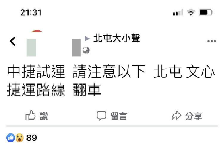 台中捷運昨日首日試營運破7萬人次搭乘,針對有網友透過臉書社團散播台中捷運文心、北屯路線翻車等假消息,台中市政府警察局於4小時內快速破案,將PO文者傳喚到案說明。台中捷運公司董事長林志盈今日於市政會議受訪強調,此案已證實是假訊息,PO文者將依社會秩序維護法究辦。