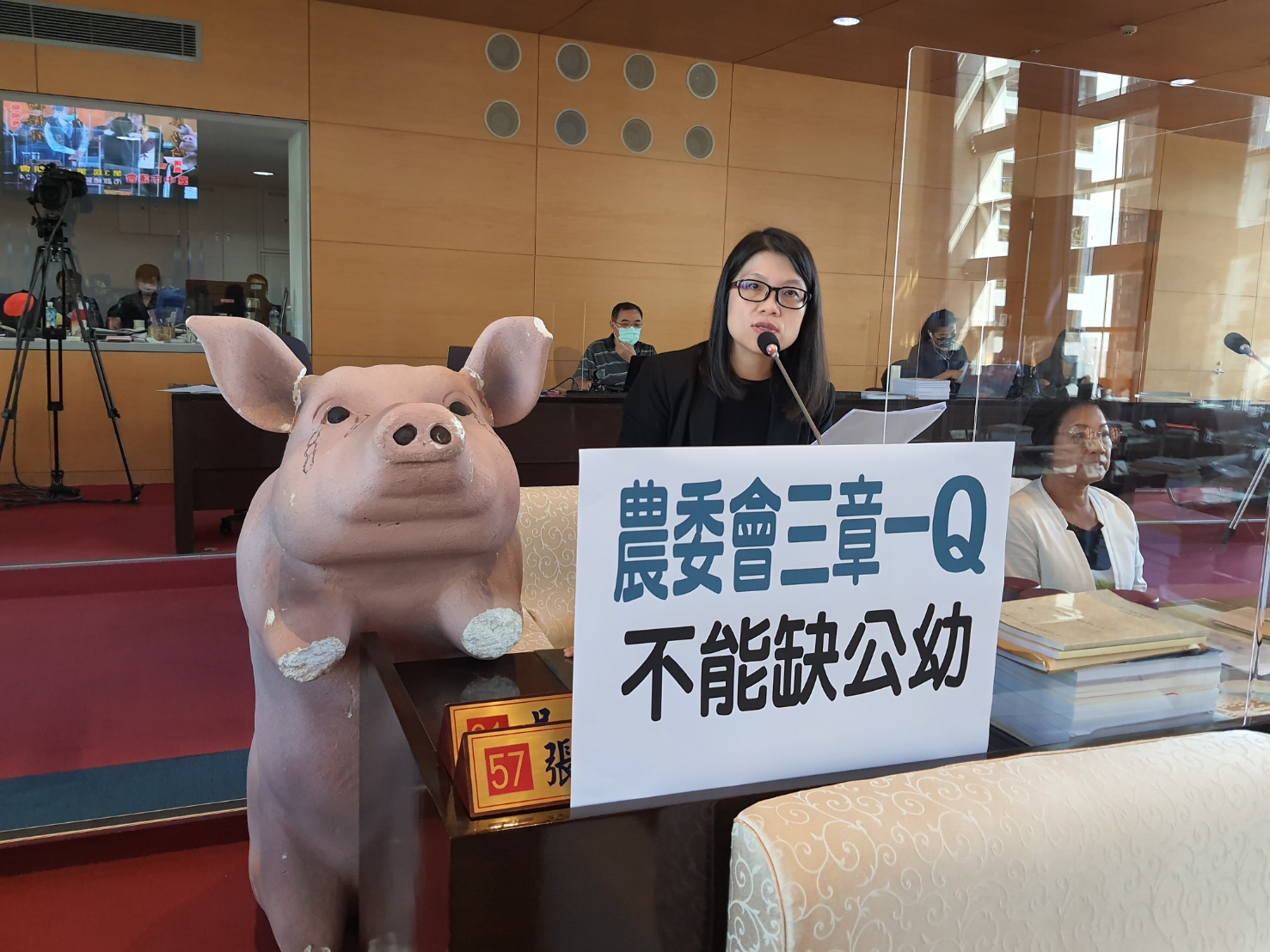 台中市議會市政總質詢,台中市議員張廖乃綸關切中央開放萊豬進口及校園營養午餐食品安全議題。張廖乃綸搬出2016年國民黨立委在立法院抗議含萊克多巴胺美豬進口時所使用的大型道具豬,要求市府一定要嚴格把關,全力防堵萊豬進入校園及幼托園所。