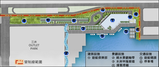 本項遊艇碼頭招商標的包含臺中港20A、20B碼頭後線土地(現為觀光遊憩商業區),包含約6.7公頃土地及4.9公頃水域,規劃以水陸域整合規劃開發方式辦理招商,並由投資人依其未來投資開發需求及營運模式自行設計興建,投資人除可於水域規劃遊艇泊位及相關營運設施,同時對於遊艇活動衍生之周邊觀光遊憩服務,亦可利用該區陸域開發吸引業者進駐投資,營造整體觀光遊憩生態圈。