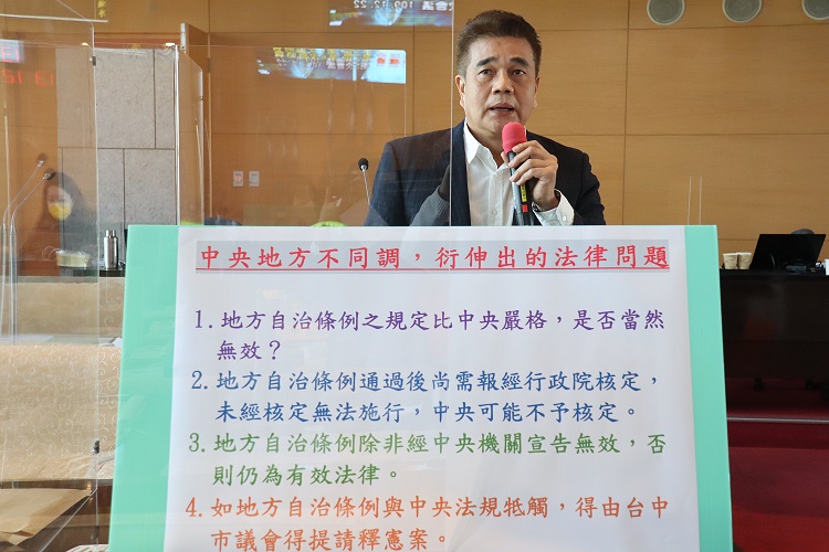 陳議員指出,當中央地方不同調時,法律會洐伸出下列問題,1.地方自治條例之規定比中央嚴格時,是否當然無效? 2.地方自治條例通過後尚需報經行政院核定,未經核定無法施行。所以表示2017年台中市地方自治條例至目前為止是具有效力。3.地方自治條例除非經中央機關宣告無效,否則仍為有效法律。4.如地方自治條例與中央法規牴觸,得由台中市議會提請釋憲案。台中市政府應聚焦在法律層面,方能完全徹底解決。