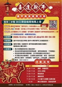 迎接新年第一個連續假期,台中市政府與逢甲觀光夜市管理委員會合作,今起舉行為期四天的「喜『逢』新年 逢甲美食優惠活動」,民眾只要至逢甲夜市拍照打卡,向工作人員出示手機證明,即可領取面額30元的飲食類攤商消費抵用券,限量發放2000張,歡迎民眾一同到逢甲夜市歡慶新年假期。