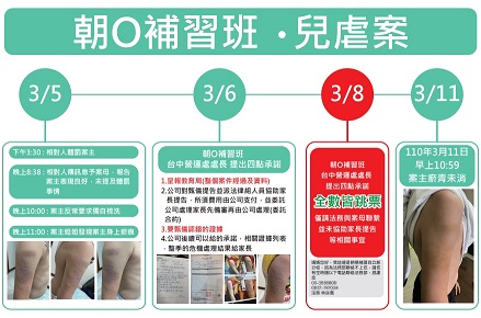 全國開設超過20間以上的「知名連鎖朝○補習班業者」,其中在位於大里立新分校,傳出重大兒虐事件。班內一位不具教師資格的女教師,因遭十歲林姓學童,連喊三聲老師後,突發性情緒失控,連續毒打該名學生近十下,造成大面積瘀傷,一直要等到家屬,深夜發現瘀血才驚覺不對勁。整起事件補教業者不僅逾時通報,且自始就不願提供家長能還原真相的事發影片,林姓孩童的母親,只好帶著驗傷單等相關證據,尋求市議員鄭功進,協助將不肖業者的兒虐行徑公諸於世,並提出法律訴訟。
