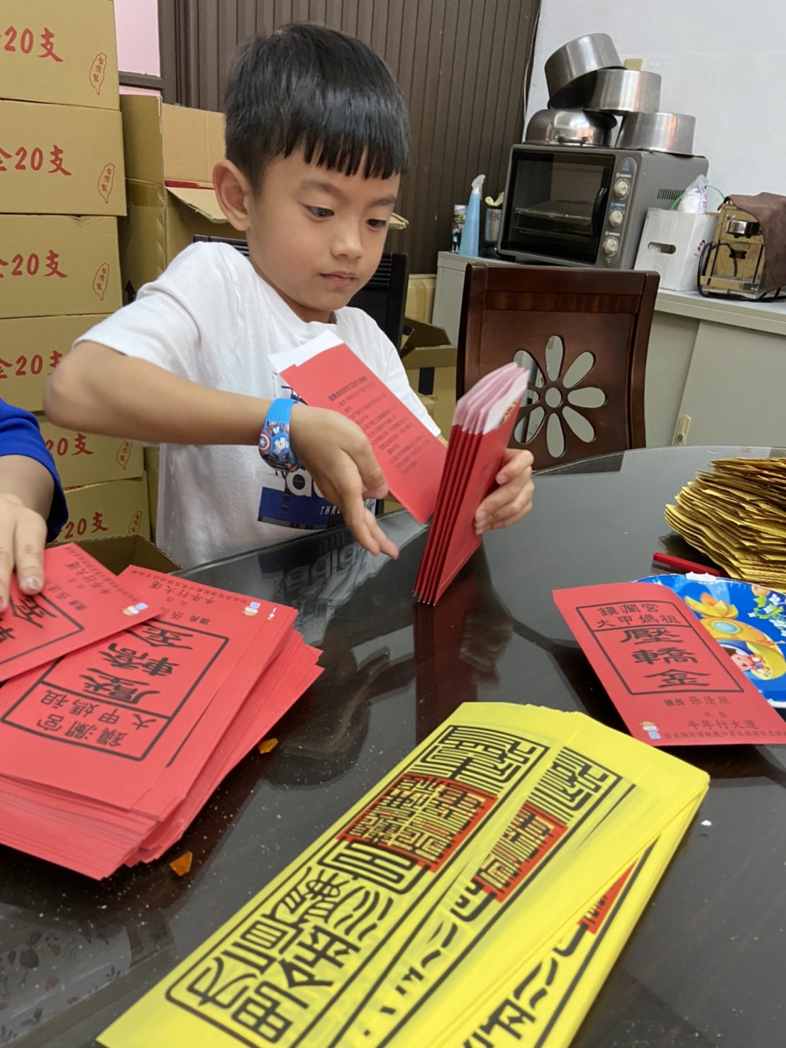 張議長服務處指出,每年大約會發送四萬份「壓轎金」,由於數量很大,事前必須靠志工朋友幫忙,將大甲媽祖的符令和壽金一一折好放入特製的紅包袋中。
