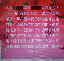 警方立即去電請竹南分局協尋,當地派出所隨即調閱監視器發現少女與一名友人約在站前門口見面,下火車後搭上計程車離開前往友人住處。經警方循線終於查獲少女在友人家中,警方帶少女返所並通知家屬前往領回。家屬終於鬆了一口氣,並於facebook發文感謝警方的積極協助,警方也終於能放心。