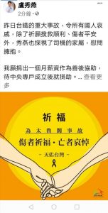 台鐵太魯閣號408車次(樹林往台東)昨日在花蓮縣大清水隧道出軌,造成多人傷亡,台中市長盧秀燕接獲消息後,第一時間指示市府相關局處組成跨局處小組展開支援及關懷慰助,今日她並透過臉書宣布,將捐出1個月個人所得,希望協助傷者及傷亡者家屬度過難關。