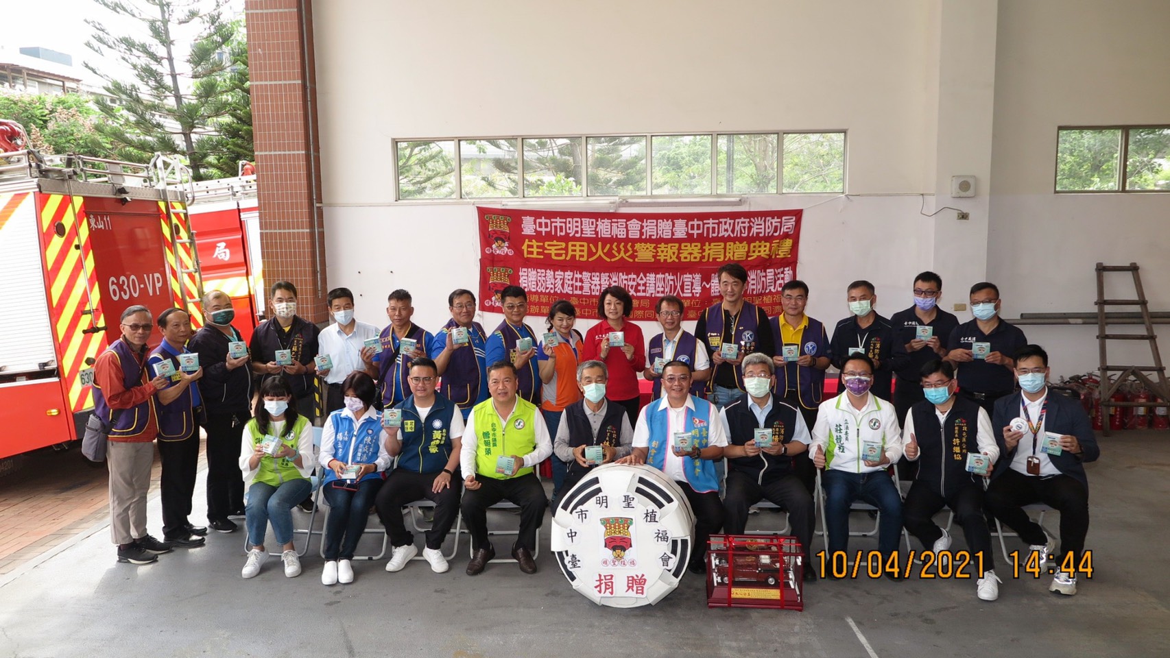 台中市明聖植福會偕南屯國際同濟會及植福國際同濟會捐贈600顆偵煙式住宅用火災警報器予台中市政府消防局,將優先提供東山分隊所轄弱勢團體裝設,昨日於東山分隊舉辦捐贈儀式,由消防局簡任技正楊純凱代表受贈,並回贈消防紀念模型車及感謝狀給明聖植福會會長陳義德。