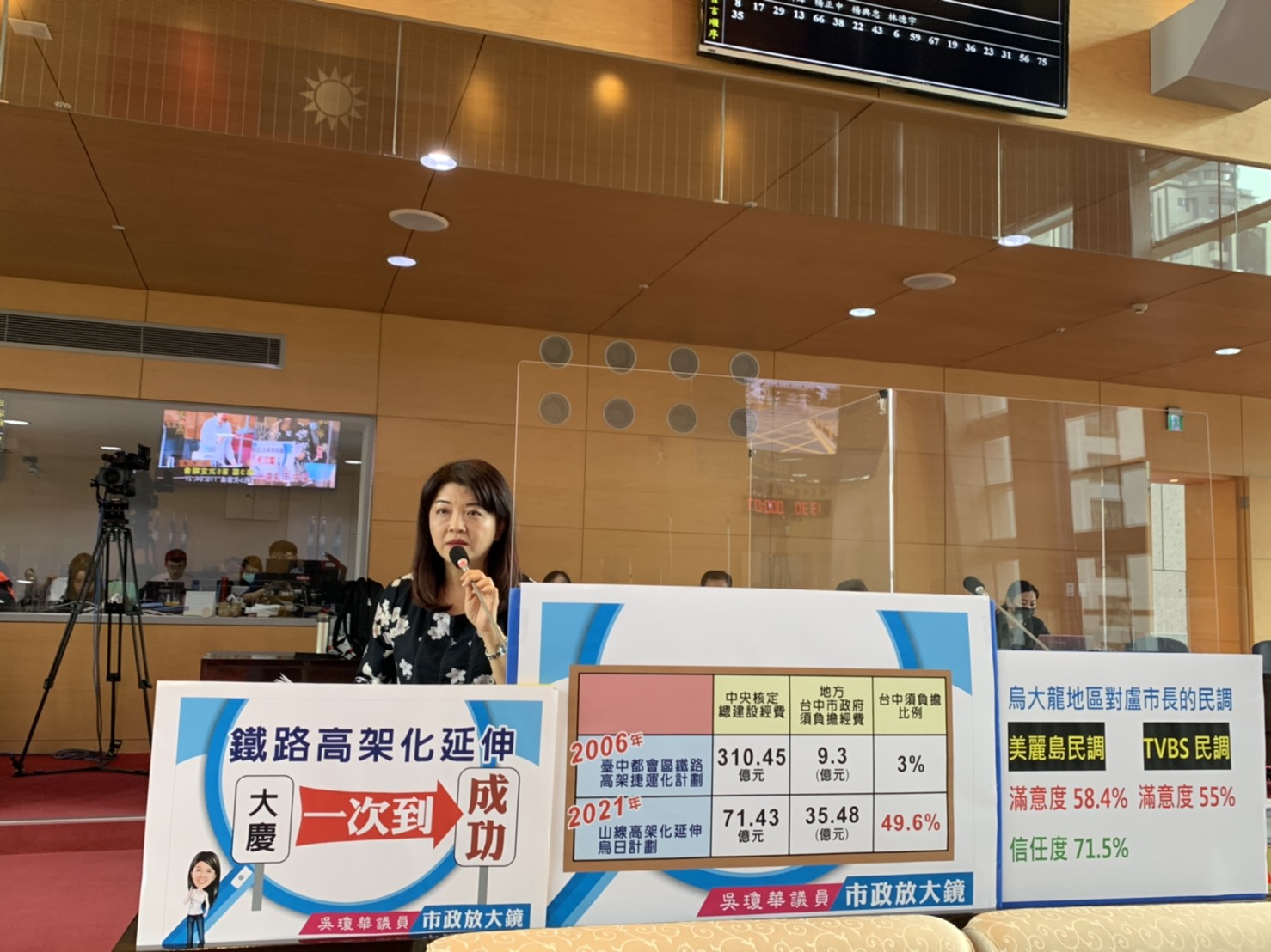 吳瓊華在議會提出計畫表示,現在山線高架化延伸烏日總經費71.43億元,中央要求台中須負擔35.48億元,因為鐵路產權及營運皆歸屬中央,台中還要負擔49.6%,真的不合理。