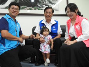 林縣長和潤發團隊合影後,注意到同行潤輝員工的1歲2月大小女娃,還開心的逗弄並順利「公孫」合影,林縣長笑著連說,我有8個孫當阿公很有經驗哦!潤輝員工還帶著1歲2個月小女娃來「見習」,相信這樣的善行義舉一定會代代永流傳。