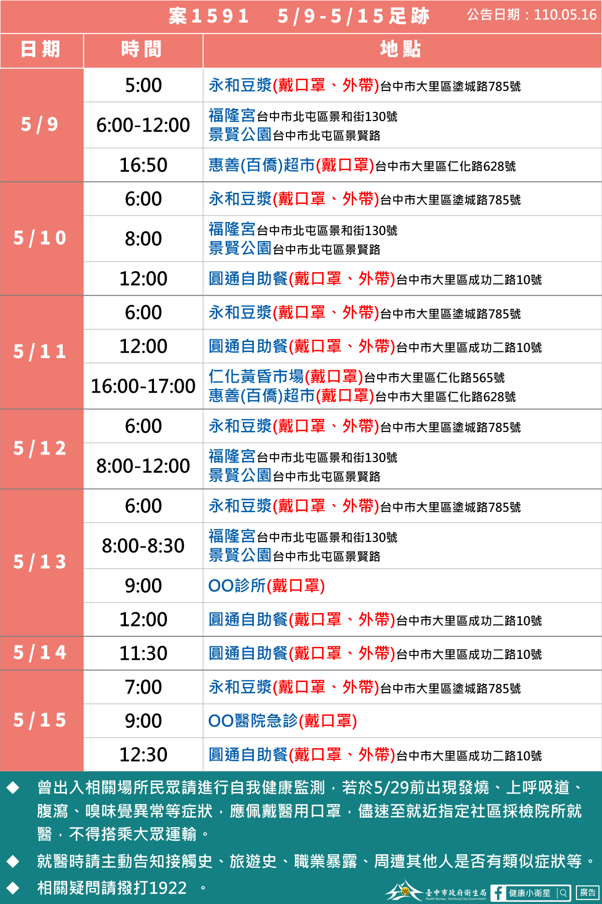 根據個案的足跡顯示,他住在大里區,但9日至13日有4天都騎機車至北屯區的福隆宮和景賢公園,對此市府表示已進行消毒且宮廟已有規定須停止相關活動。