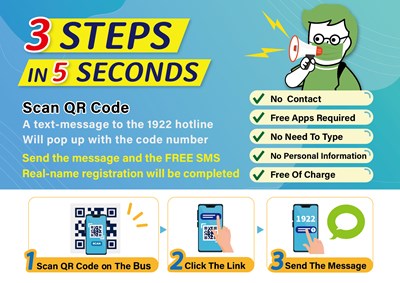 交通局指出,公車簡訊實聯制步驟簡單快速,僅須掃描公車上的QR-CODE,並依指示將簡訊送出,很快就可以完成公車簡訊實聯制。簡訊實聯制擁有「免個資、免APP、免打字、免接觸、免收費」五大優勢,資料蒐集僅供疫調使用,超過28天將自動刪除,民眾無須擔心隱私問題。