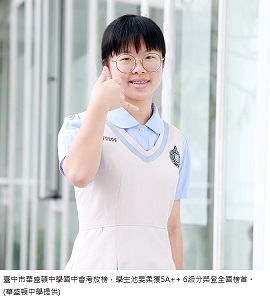 副校長黃苓娟指出,腳踏實地的池同學,與天資聰穎的鄒同學,即便擅長科目不同,也常會趁著下課,彼此討論及學習,對班級學習氛圍的營造,兩人也起到帶頭作用。放棄台中一中的入學機會選擇直升的鄒文華表示,老師的多元補充、連結時事,看到題目後可以快速聯想出獨有的意義,在學習時能舉一反三、觸類旁通。同時池旻柔也大方分享拿滿分的訣竅,池旻柔強調,從上國中後,固定每天複習自然1個小時,每天利用零碎時間,不中斷的寫國文與英文的閱讀測驗題。還有,精準的安排複習時間進度,有效率的解決每科難題。面對疲累挫折時,也要讓自己隨時保持正能量,才能在短時間內調整好心情。一直到會考前,都要維持穩定的學習節奏。最重要的,當然是每堂課認真聽講,記下老師們的重點補充。