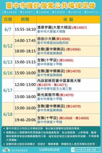曾局長補充,此次群聚案家庭主要居住在東區與大里區,目前未有擴散情形,但謹慎起見,市府今日已請國軍台中總醫院自9時至17時、大里仁愛醫院自14時至17時提供快篩服務,如有足跡重疊或不適症狀者可前往篩檢。